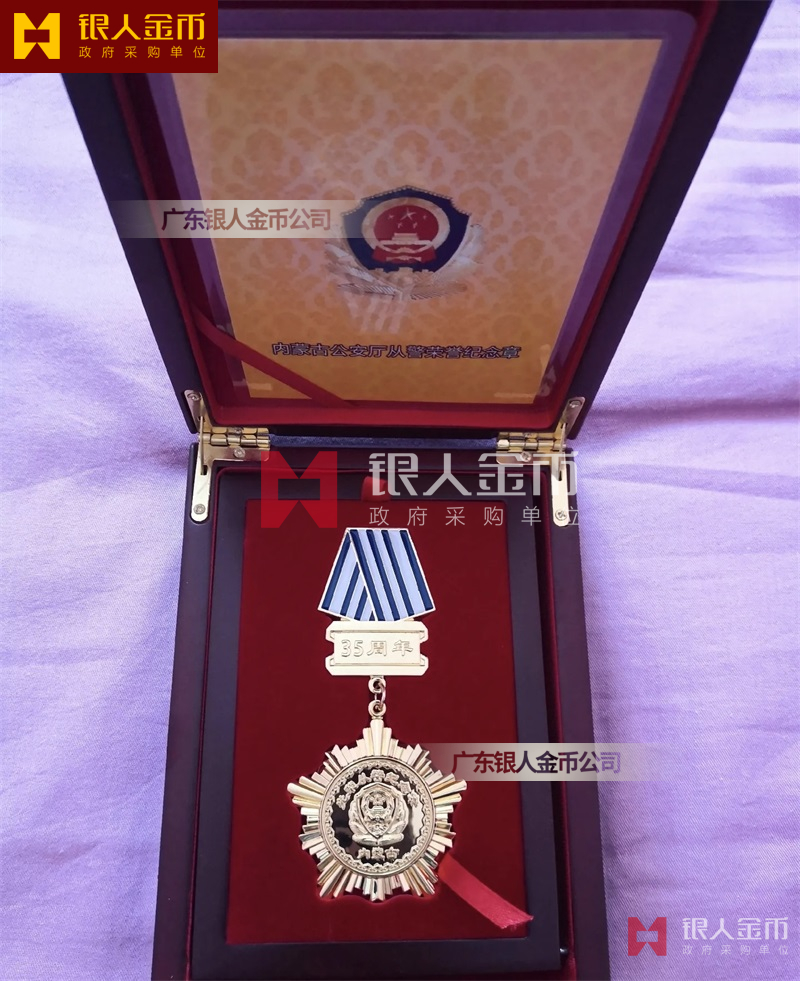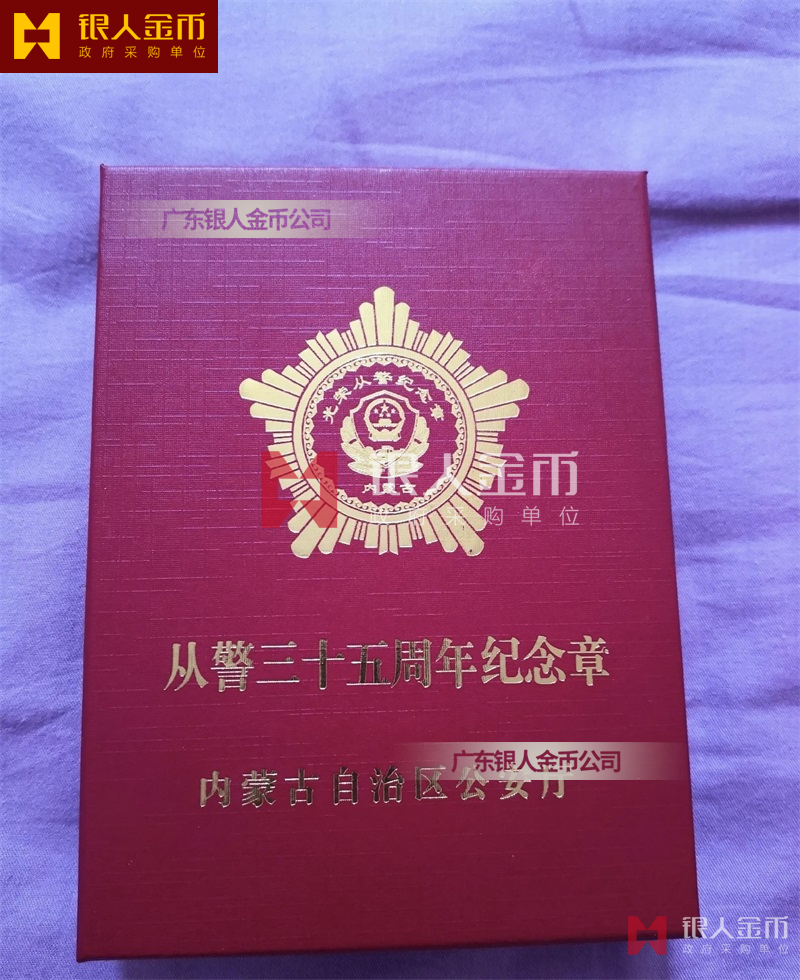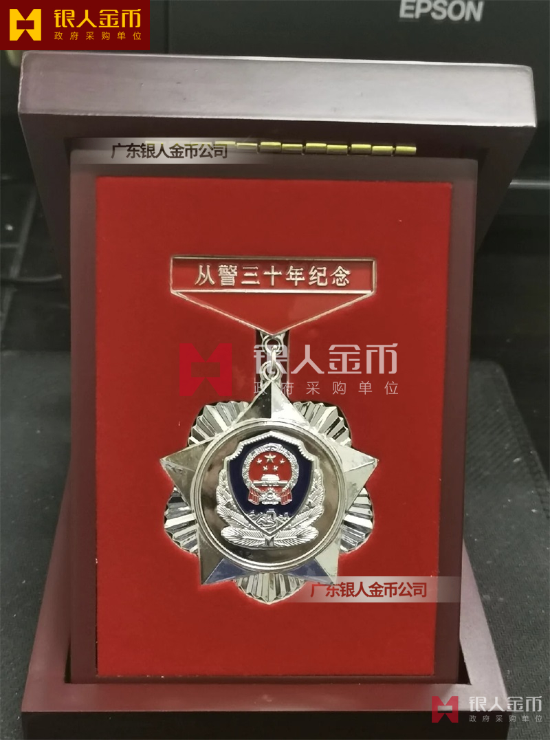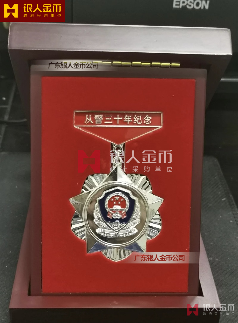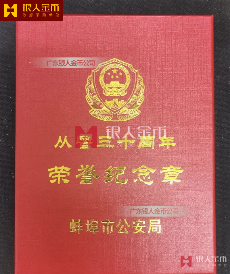 從警紀念章定制,從警年限紀念章定制,從警獎章定制——從警紀念章的底下主體部分都是警徽,上面橫檔部分是不相同的,有:“從警十年紀念(從警10年紀念章)”、“從警二十年紀念(從警20年紀念章)”、“從警三十年紀念(從警30年紀念章)”、“從警四十年紀念(從警40年紀念章)”不同的,從警十年紀念章(從警10年獎章)表面是鍍銅色(銅質獎章)、從警二十年紀念章(從警20年獎章)表面鍍銀色(銀質獎章)、從警三十年紀念章(從警30年獎章)和從警四十年紀念章(從警40年獎章)表面鍍金色(金質獎章) ,整體將從警獎章或從警紀念章(從警特定年限紀念章也叫從警章)鑲嵌在三折的立式木盒上面,木盒外面配有紙盒,整體做工精美,木盒紙盒上面都刻有警徽從警年限等。